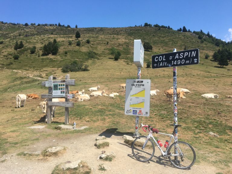 Hourquette d‘Ancizan und der Col d‘Aspin In der Nacht hat es kräftig geregnet. Der Morgen ist trüb. Den Plan, eine große Runde inklusive Col du Tourmalet zu fahren, muss ich verwerfen. Zu kurz ist die Zeitspanne zwischen trockenen Straßen und angekündigten Gewittern am Nachmittag. Jeder, der im Hochgebirge mal in ein Unwetter geraten ist, weiß, wie riskant das auf einem Rennrad auf einem Pass sein kann. Kurzerhand wird eine abgespeckte Tour gebastelt. Ab Bagnières-de-Bigorre habe ich die Qual der Wahl. Der Col d‘Aspin, der Col du Tourmalet und die Hourquette d‘Ancizan sind allesamt in Schlagdistanz. Das Hütchenspiel entscheidet. Ich starte mit der Hourquette d‘Ancizan. Eine gute Stunde bin ich durch das Campan-Tal bis zum Beginn der Steigung unterwegs. Inzwischen habe ich Bilderbuchwetter. Familien sitzen an kleinen Bächen mit glasklarem Wasser und picknicken. Nadelwald links und rechts auf den ersten Kilometern. Gerade Nadelwald wirkt auf mich bei langen Anstiegen immer besonders beruhigend. Auch den dortigen Schatten nehme ich gerne in Anspruch. Der Wald lichtet sich und ein traumhaftes Tal präsentiert sich in saftigem Grün, der Wildbach weiterhin rechts von mir. Die Hourquette d‘Ancizan entpuppt sich als wahres Juwel unter den Pässen.